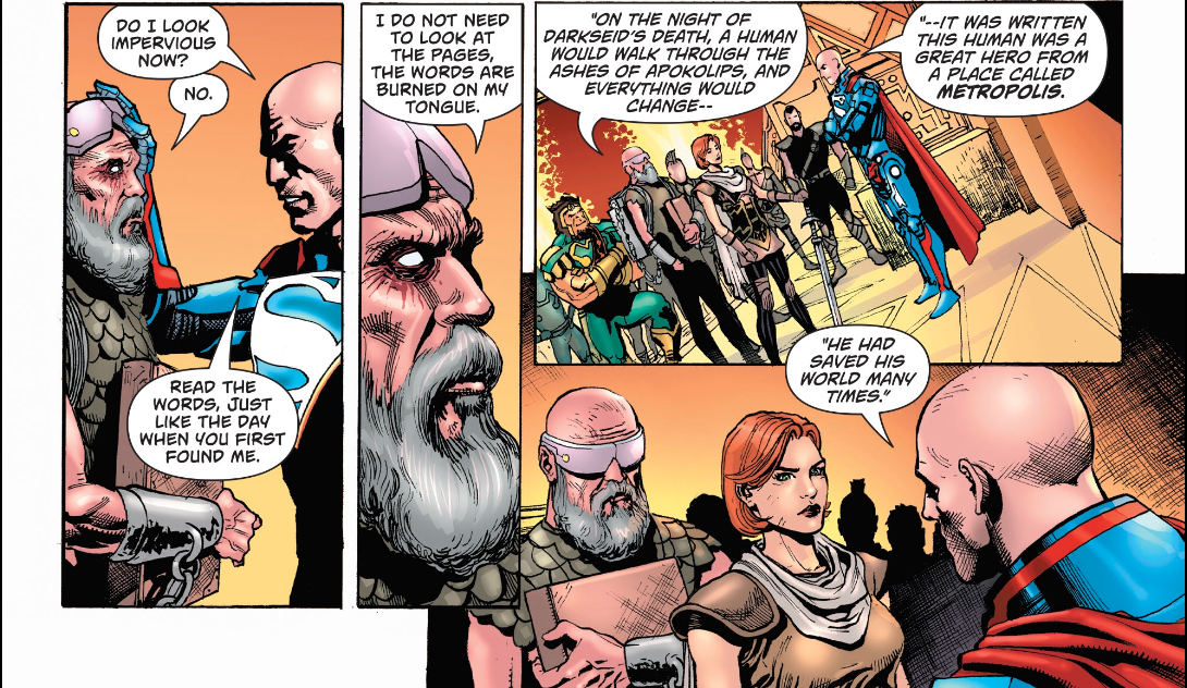 While Lex wants power and respect on Earth, he isn’t comfortable being forced into the role of ruler of an alien world. Knowing Darkseid’s zealots believe he’s the subject of a prophecy, he uses their words against them.