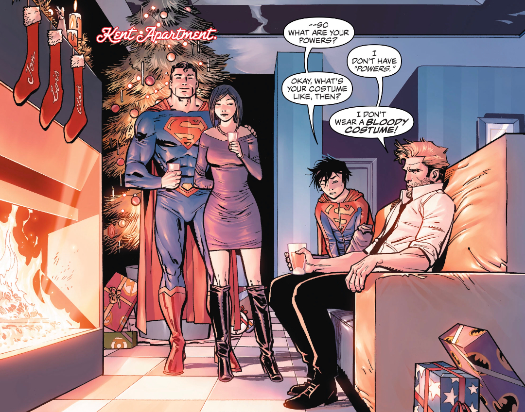 Things are cheerier as we return to the Superman framing sequence, and Clark takes John Constantine home to meet the family. I wonder if son Jon noticed the resemblance to Manchester Black or if he was too busy being embarrassed by the tightness of his parents’ outfits.